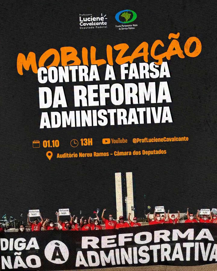 A Frente Parlamentar Mista em Defesa do Serviço Público realiza nesta quarta-feira, dia 1°, uma mobilização contra o projeto da Reforma Administrativa. O ato tem início a partir das 13h, no Auditório Nereu Ramos, da Câmara dos Deputados, em Brasília, com transmissão ao vivo no YouTube pelo canal da deputada federal Professora Luciene Cavalcante.