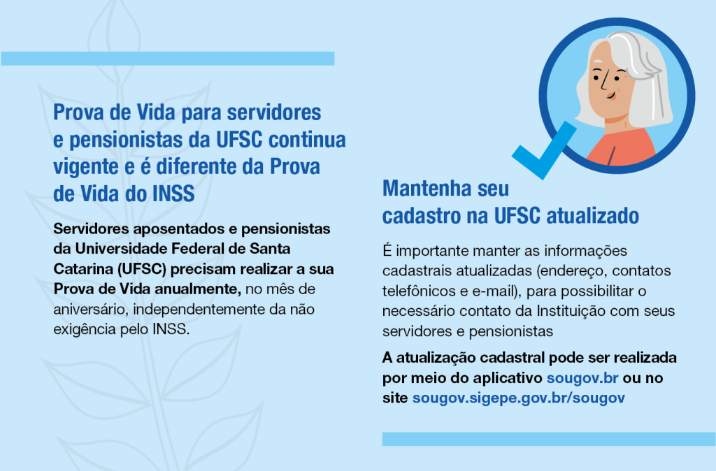 A Prova de Vida é uma responsabilidade exclusiva do beneficiário. Desde 2023, o INSS passou a realizar a Prova de Vida de forma automatizada, com cruzamento de bases de dados governamentais. Porém, os aposentados e pensionistas da UFSC não estão incluídos neste processo automático e, portanto, precisam realizar o procedimento de forma ativa.