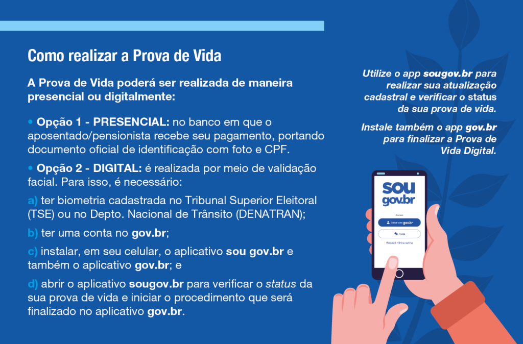 O procedimento consiste na comprovação de vida do beneficiário, que deve verificar a regularidade da Prova de Vida diretamente no banco ou pelos aplicativos Gov.br ou SouGov. Certifique-se de que o status esteja marcado como “regular”.
