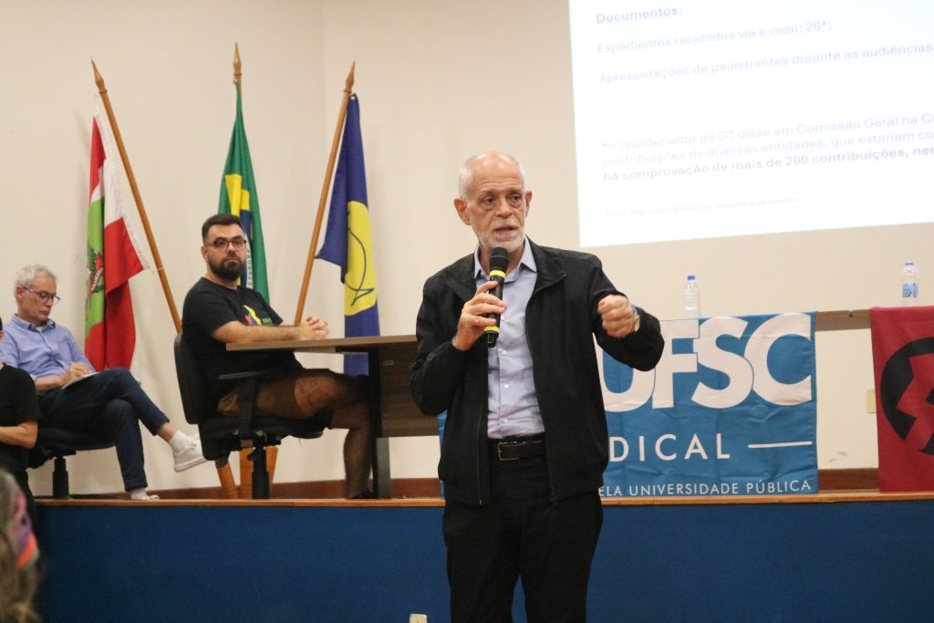 O coordenador de Formação, Memória e Políticas Sindicais do Sintufsc, Maicon Claudio da Silva, alertou que “a nossa categoria está em extinção, todos os dias temos um TAE a menos na universidade”. “Nós como sociedade temos que ter clareza que esse é o projeto da burguesia para o estado”, acrescentou.