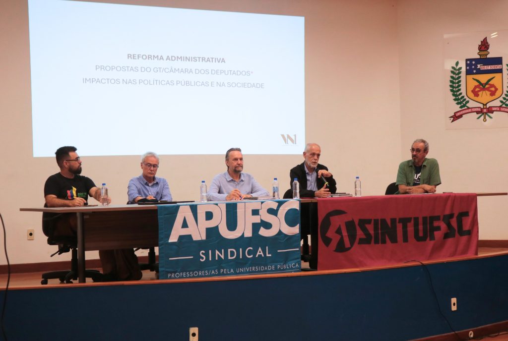 Debate com o tema “A Reforma Administrativa e seus Impactos no Serviço Público” foi realizado na tarde desta quinta-feira, dia 23, no auditório da Reitoria da UFSC, em Florianópolis. O evento foi realizado pela Apufsc-Sindical e pelo Sintufsc, e contou com a participação do consultor sindical Vladimir Nepomuceno, ex-diretor do Departamento Intersindical de Estatística e Estudos Socioeconômicos (Dieese/DF), do Departamento Intersindical de Assessoria Parlamentar (Diap) e da Secretaria de Relações do Trabalho no Ministério do Planejamento, Orçamento e Gestão. Ele também atuou no Ministério da Fazenda e assessora a Frente Parlamentar Mista em Defesa do Serviço Público. O deputado federal catarinense Pedro Uczai (PT), que faz parte da Frente, também esteve presente no evento.