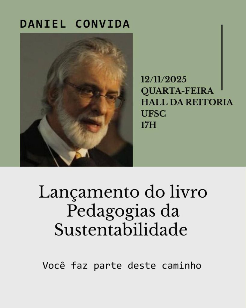 O professor Daniel José da Silva lança na quarta-feira, dia 12, o livro “Pedagogias da Sustentabilidade”, no hall da Reitoria da Universidade Federal de Santa Catarina (UFSC), em Florianópolis. O manual de formação é o resultado de uma pesquisa iniciada em 2011, quando o professor atuava no Departamento de Engenharia Sanitária e Ambiental. Nos últimos anos, a obra passou por atualização da revisão bibliográfica e da reflexão em torno da fundamentação ética, epistêmica e metodológica das nove pedagogias que compõem a “arquitetura pedagógica da sustentabilidade”, reunidas neste volume.