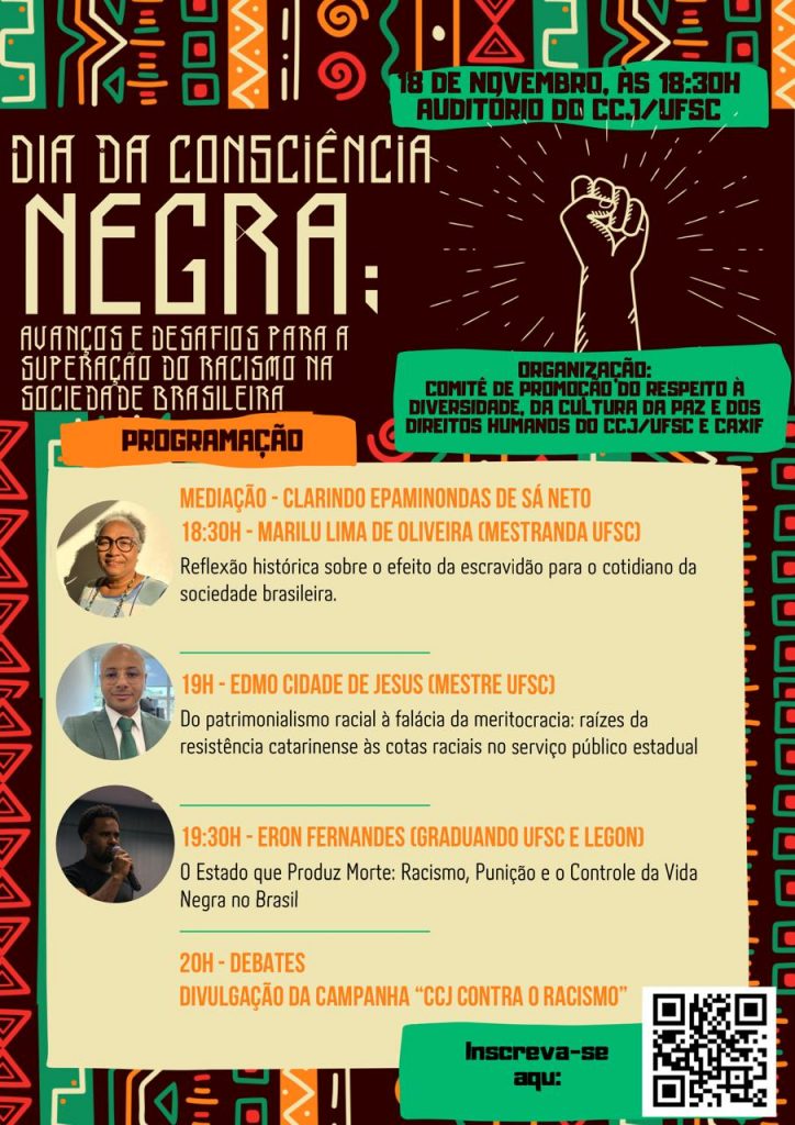 O Comitê de Diversidade do Centro de Ciências Jurídicas (CCJ) da Universidade Federal de Santa Catarina (UFSC) realiza evento nesta terça-feira, dia 18, em alusão ao Dia da Consciência Negra. Na ocasião, também será lançada a campanha “CCJ contra o racismo”.