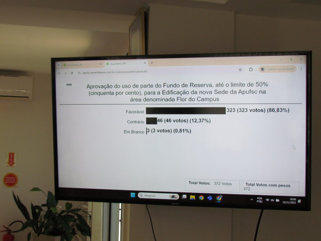 Foi aprovado, por ampla maioria dos filiados e filiadas da Apufsc-Sindical, em votação eletrônica, “o uso de parte do fundo de reserva, até o limite de 50%, para edificação da nova sede do sindicato na área denominada Flor do Campus”. Dos 372 votos, 86,8% (323) foram favoráveis (323), 12,4% (46) foram contrários e 0,8% (3) em branco. A votação iniciou às 10h de terça-feira, dia 18, e encerrou às 10h desta sexta-feira, dia 21.