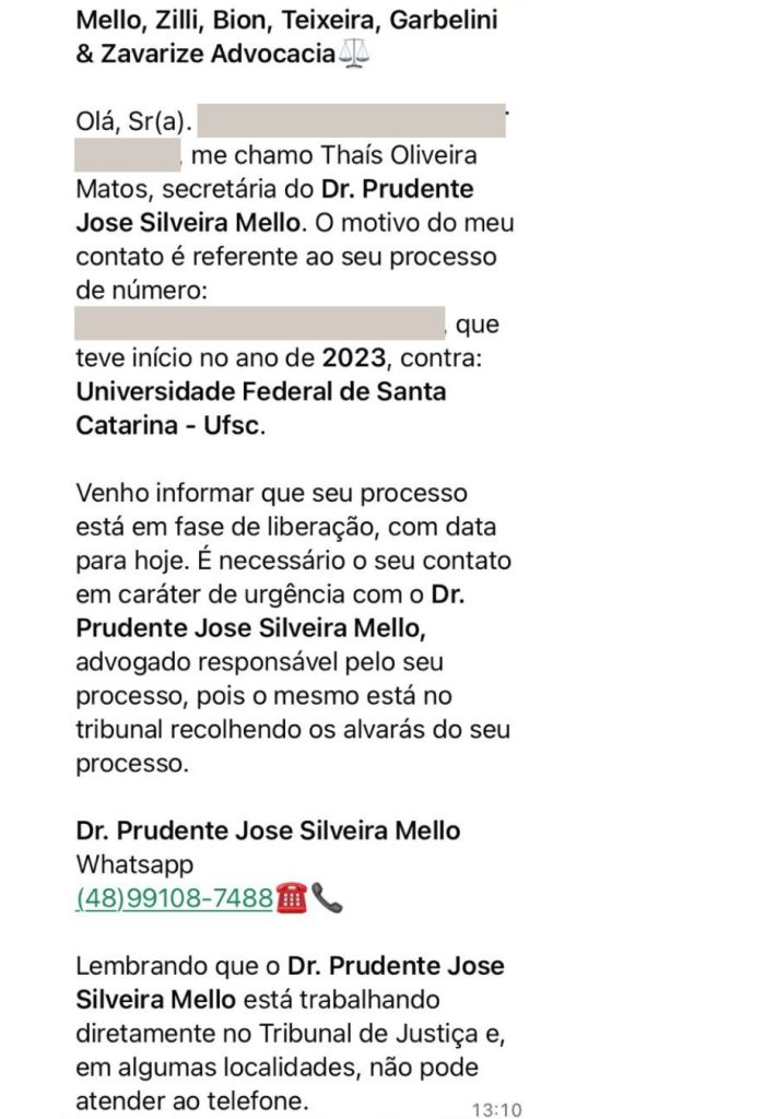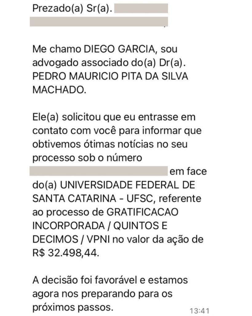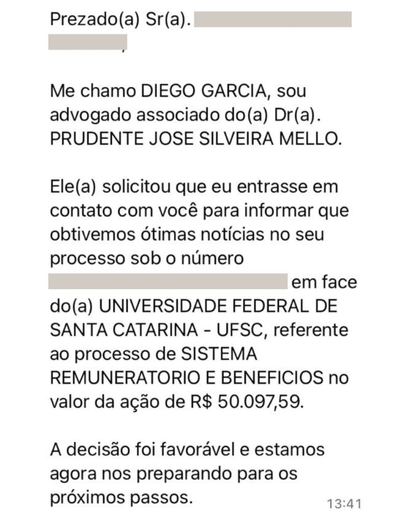 A Apufsc-Sindical alerta sobre uma nova tentativa de golpe que vem sendo aplicada contra filiados e filiadas do sindicato. Desta vez, uma pessoa que se identifica como Diego Garcia afirma ser advogado associado aos escritórios do Dr. Pedro Pita Machado e do Dr. Prudente Mello. Há também outra tentativa em que o golpista se apresenta como Thaís Oliveira Matos e diz ser secretária do escritório Mello, Zilli, Bion, Teixeira, Garbelini & Zavarize Advocacia.