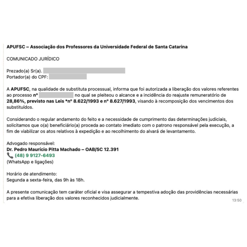 Além disso, em outros casos, os golpistas falam da liberação de valores como o do reajuste de 28,86%. A Apufsc esclarece que essa ação já foi encerrada e que não há mais o que solicitar ou receber dela.