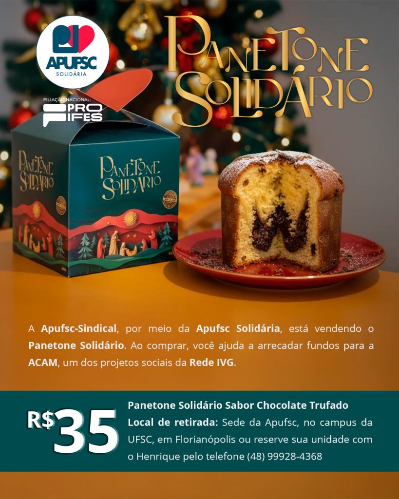 Cada unidade do panetone sabor Chocolate Trufado (400g) custa R$ 35 e pode ser adquirida na sede da Apufsc, no campus da UFSC em Florianópolis, ou diretamente com Henrique, pelo telefone (48) 99144-3002. As quantidades são limitadas.