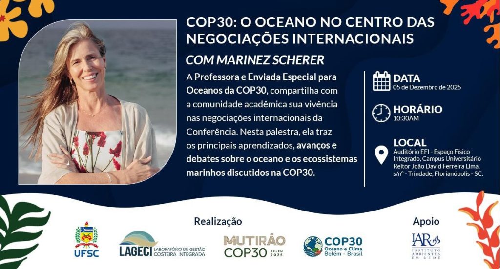 COP30: O oceano no centro das negociações internacionais” é o tema da palestra que ocorre nesta sexta-feira, dia 5, às 10h30, no auditório Espaço Físico Integrado (EFI) na Universidade Federal de Santa Catarina (UFSC), campus Trindade. A atividade é promovida pelo Laboratório de Gestão Costeira Integrada (Lageci) e pelo Programa de Pós-graduação em Oceanografia (PPGOceano).
