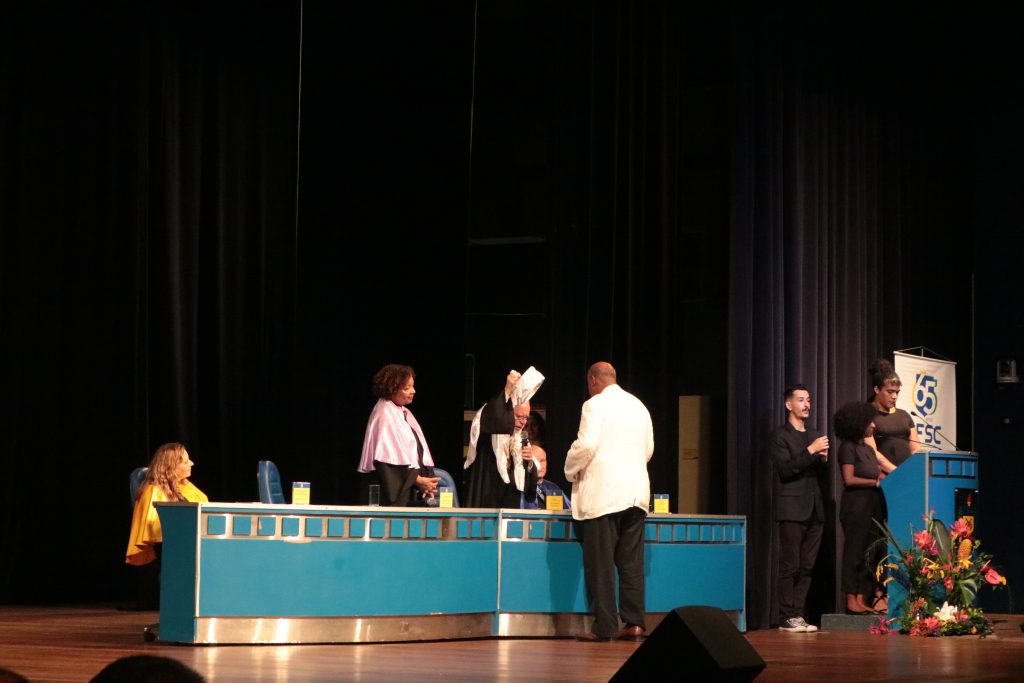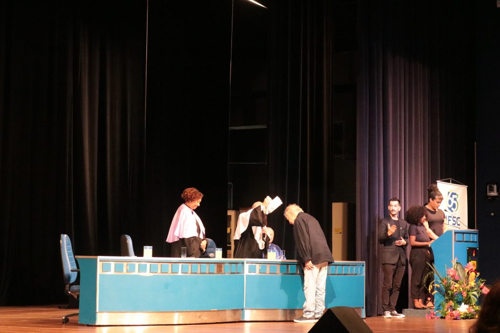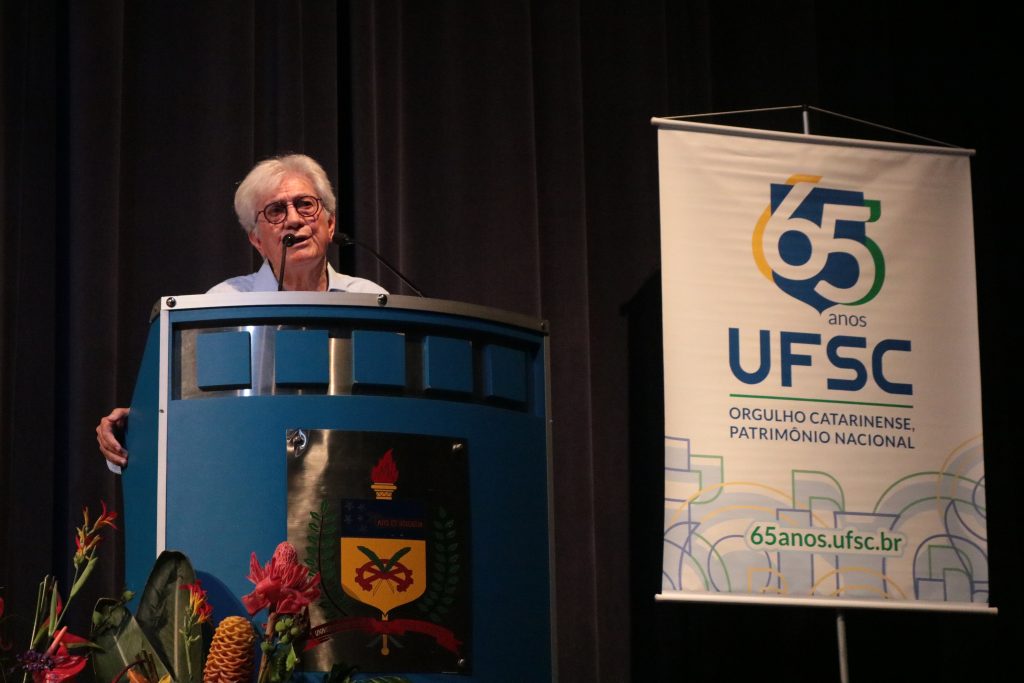 Sessão solene do Conselho Universitário (CUn) na manhã desta segunda-feira, dia 15, celebrou os 65 anos da Universidade Federal de Santa Catarina (UFSC) e contou com a entrega de títulos de Professor Emérito e Doutor Honoris Causa. Além disso, pela primeira vez na instituição, técnicos-administrativos em Educação (TAEs) foram homenageados como referências em suas áreas de atuação.
