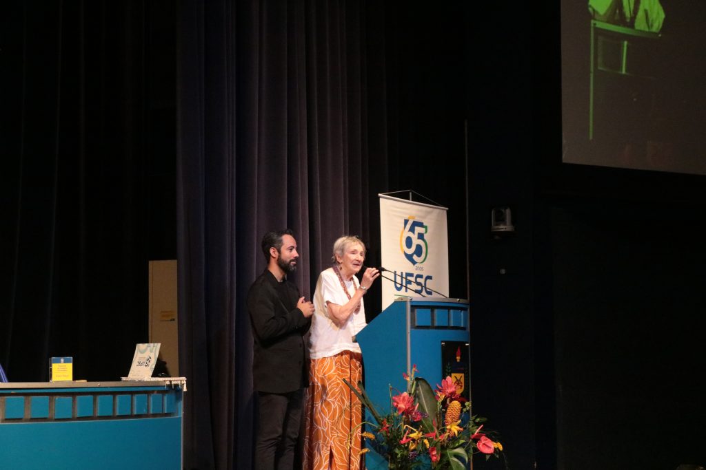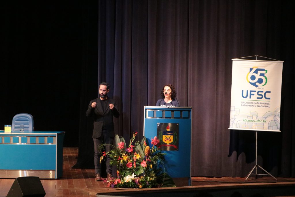 Representando a Diretoria da Apufsc-Sindical, a vice-presidente Karine Simoni afirmou que celebrar os 65 anos da UFSC é “falar dos professores e professoras que a construíram e que sempre a defenderam”. Karine destacou ainda a importância da autonomia e da liberdade de cátedra, e de políticas públicas como as ações afirmativas.