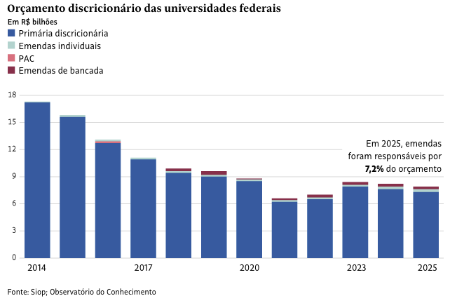 De acordo com análise do Observatório do Conhecimento, as 69 instituições de educação superior mantidas pela União receberam R$ 571 milhões do parlamento em 2025. O montante correspondeu a aproximadamente 7,2% da verba discricionária das instituições, aquela destinada ao funcionamento das unidades.