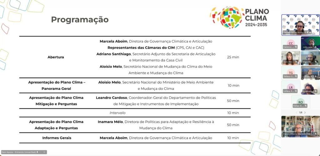 O convite para o evento online foi feito pela Secretaria-Executiva do CIM, ligada ao Ministério do Meio Ambiente e Mudança do Clima. Na ocasião, foram apresentadas as estratégias, planos setoriais, diretrizes, objetivos, metas e indicadores relacionados ao plano.
