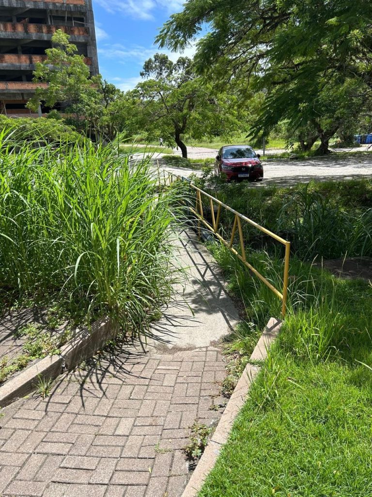 Na foto abaixo vê-se o mato quase impedindo o uso de uma ponte importante entre o EFI, o CCE e o estacionamento do CSE e do Colégio de Aplicação. Provavelmente este “problema” não existirá até 9/3, dada a simplicidade em resolvê-lo. Seria inédito começarmos o semestre com o mato tomando posse dos espaços universitários. Ao fundo, o prédio administrativo do CFM em construção, sem cercamento, o que, como denunciou o próprio reitor, então em campanha, há exatamente quatro anos, desrespeita a legislação.