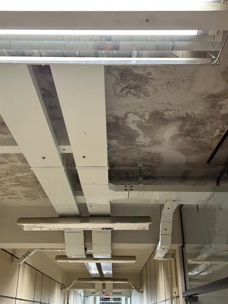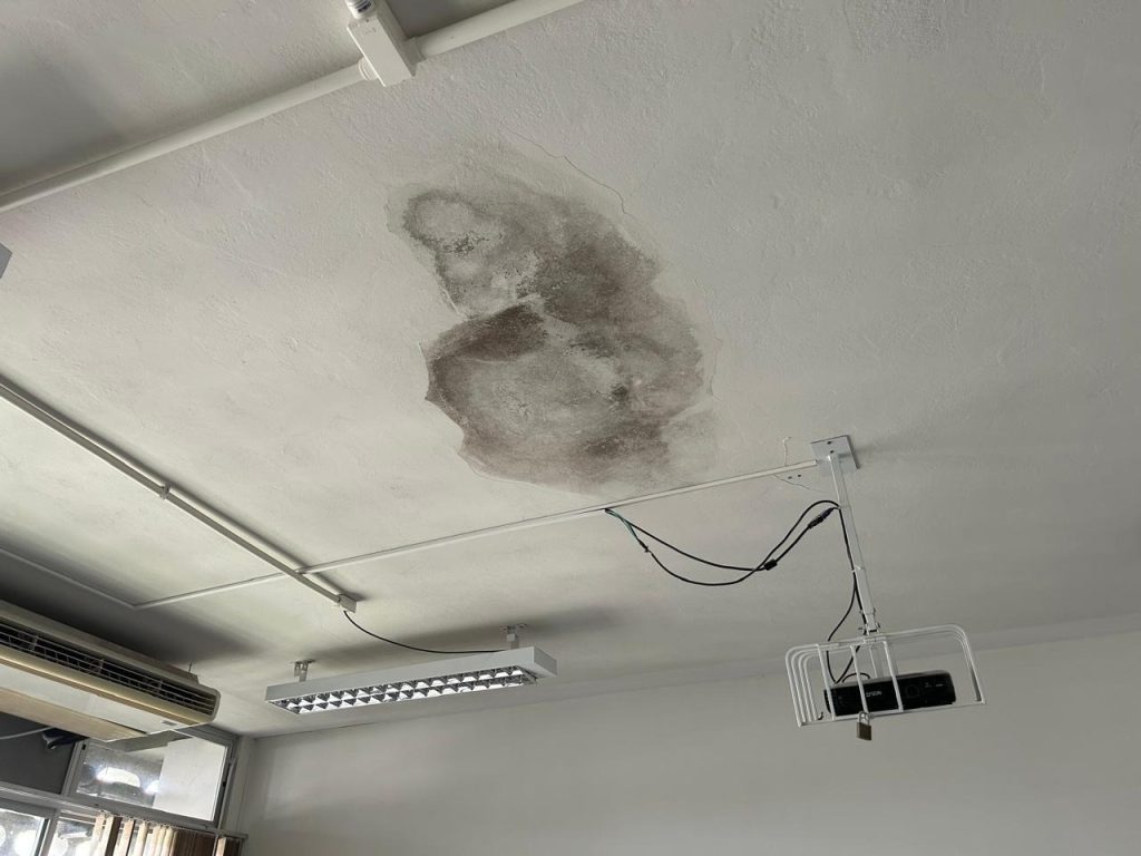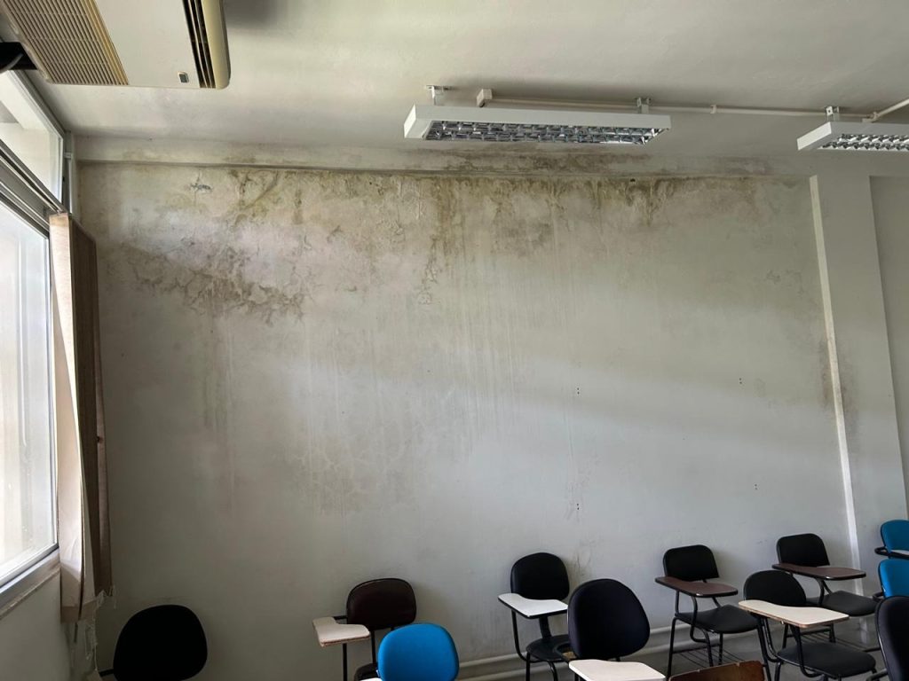 Nas fotos seguintes, mostramos as condições de duas salas de aula no prédio G1 do Depto. de Física. Deste assunto já tratei em meu artigo anterior: mofos em paredes, algumas vezes causados pela ineficácia dos aparelhos de ar condicionado, o que é prejudicial à saúde, além de criar um ambiente que não incentiva o bom ensino e aprendizado. Aqui, também a solução é simples: manutenção dos canos de escoamento e do teto dos prédios da UFSC. Mas esta certamente não será feita até segunda próxima, visto que o CFM já solicitou esta manutenção há anos e apenas conseguimos, com a reitoria, reuniões que geraram somente promessas vazias. Se você for o pai ou a mãe de um potencial aluno da UFSC, este panorama o incentivaria a matricular sua(eu) filha(o) em nossa instituição, apesar da competência de seus servidores e de nossos cursos bem avaliados?