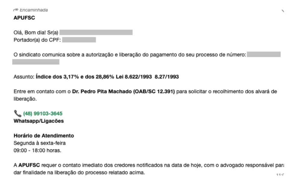 A Apufsc-Sindical alerta filiados e filiadas para um novo golpe em que uma pessoa se passa pelo Dr. Pedro Pita Machado, advogado de um antigo escritório que já atendeu o sindicato, e comunica sobre uma falsa autorização e liberação de pagamento de um processo. A mensagem golpista solicita ainda que o docente entre em contato com um número para concluir o “recolhimento do alvará de liberação”.
