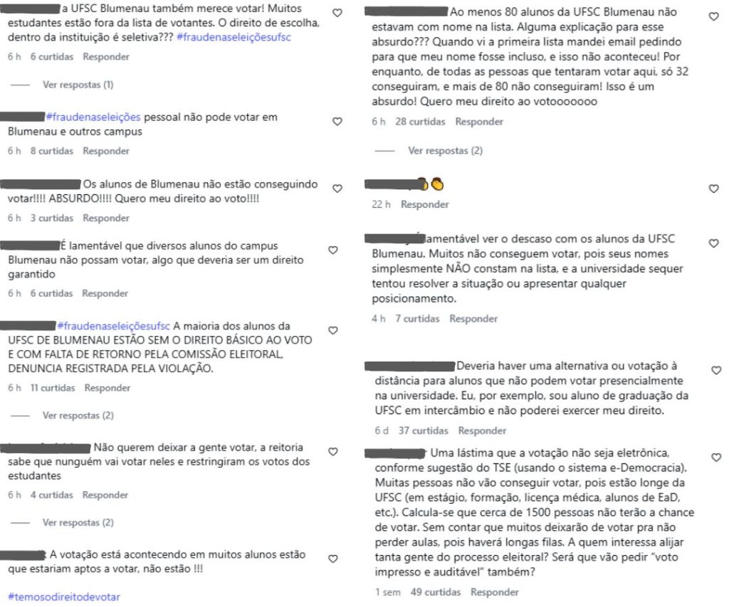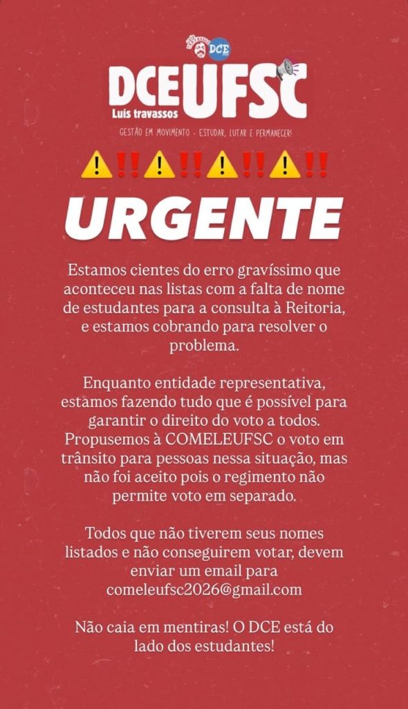 Durante o dia, uma série de reclamações marcou o processo. Docentes que terão os nomes preservados procuraram a Apufsc-Sindical para pedir orientações. “Meus alunos da pós que possuem matrícula vigente, com ingresso em 2026, não puderam votar pois ‘o nome não consta na lista'”, disse um dos relatos.