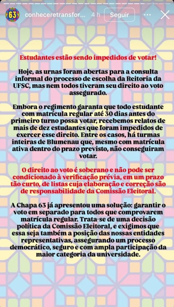 A chapa 63 – Conhecer é Transformar também denunciou nas redes sociais que turmas inteiras estavam impedidas de votar, apontando que as listas e a correção são de responsabilidade da Comeleufsc. Conforme o candidato a reitor João Luiz Martins, só em Blumenau foram mais de cem estudantes que não tiveram o direito ao voto garantido. Na postagem nas redes sociais, a chapa apontou como sugestão “o voto em separado a todos que comprovarem matrícula regular”.