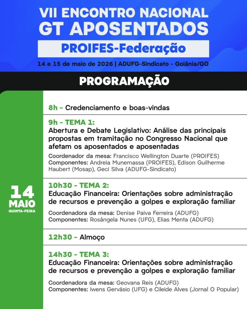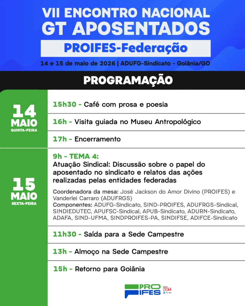 Entre os dias 14 e 15 de maio o Proifes-Federação realiza o VII Encontro Nacional dos Aposentados, que reunirá professores e professoras aposentados das Instituições Federais de Ensino de todas as regiões do Brasil na sede do Adufg-Sindicato, em Goiânia (GO). A programação inclui quatro mesas temáticas com a participação de especialistas de diversas áreas, de entidades como o Proifes, Mosap e o jornal O Popular.