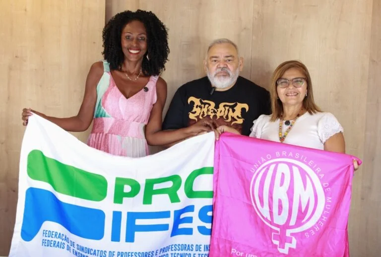 Na última sexta-feira, dia 27, o Proifes-Federação recebeu a visita da presidenta nacional da União Brasileira de Mulheres (UBM), Vanja Santos, e da secretária de organização da entidade que luta pelos direitos e a defesa das mulheres, Laudijane Domingos. Elas entregaram ao presidente do Proifes, Wellington Duarte, a cópia de uma carta encaminhada pela UBM à presidência da Câmara dos Deputados, pela inclusão do Projeto de Lei 896/2023 na pauta de votações.