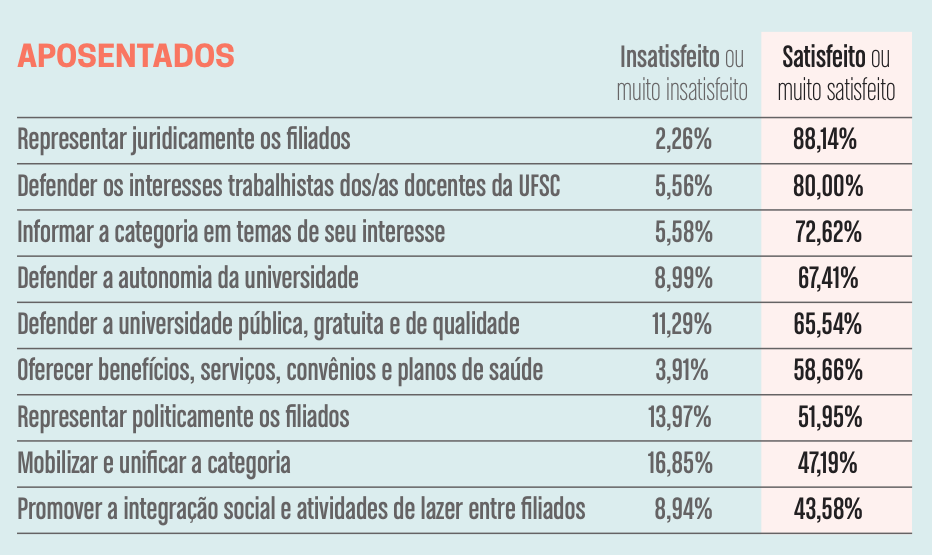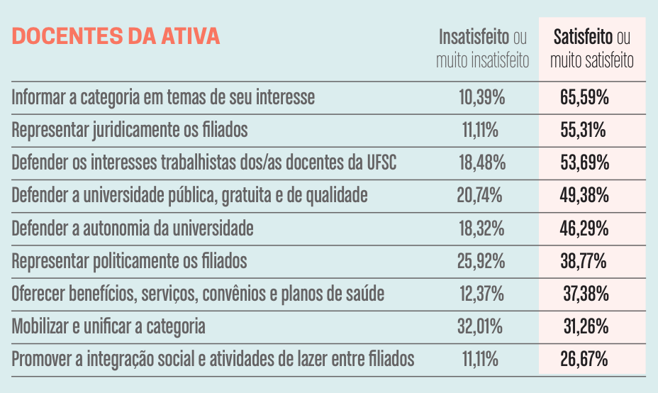Na pesquisa do Lastro, os professores também foram indagados sobre seu grau de satisfação em relação a 12 funções do sindicato. Os maiores graus de satisfação foram apontados na seguinte ordem: “Informar a categoria em temas de seu interesse”, “defender juridicamente os filiados” e “defender os interesses trabalhistas dos docentes da UFSC”. As maiores insatisfações estão nas funções de “mobilizar e unificar a categoria” e “representar politicamente os filiados”.