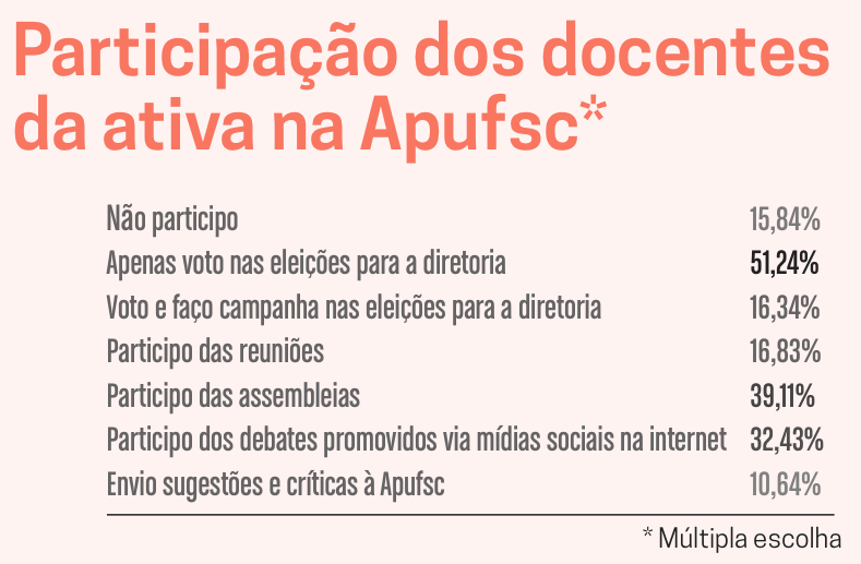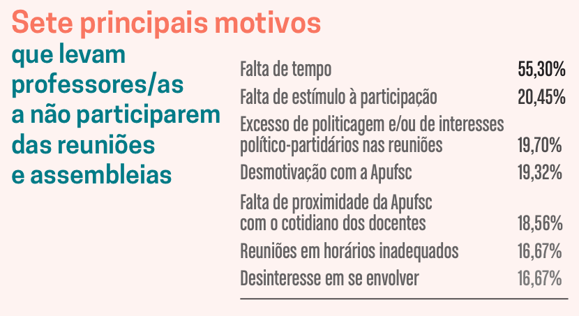 Entretanto, metade dos respondentes participa da Apufsc apenas ao votar nas eleições para a diretoria e 16% afirma nunca participar. Entre os que disseram não participar de reuniões e assembleias promovidas pelo sindicato, o maior motivo alegado é a falta de tempo, com 55,3% assinalando essa opção. Mas também há os que não participam por “desmotivação com o sindicato” e por “falta de estímulo”. Há críticas ao caráter “ideológico” de posicionamentos da entidade, com menções a “pautas esquerdistas” e a “posturas conservadoras”.