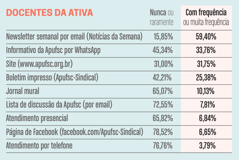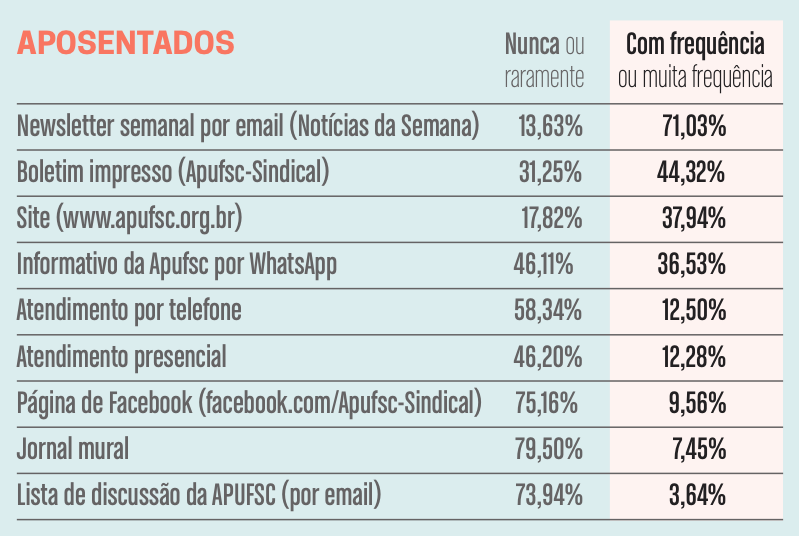 Professores da ativa e aposentados também responderam a questões sobre hábitos de informação ligados ao sindicato. No primeiro grupo, a newsletter semanal por e-mail (Notícias da Semana) é o canal de comunicação utilizado com mais frequência: 59,4% afirmam acessá-la com frequência ou com muita frequência. O informativo do sindicato via WhatsApp é o segundo em uso frequente, seguido do site oficial. Os canais com mais baixo uso declarado são a página no Facebook, a lista de discussão da Apufsc por e-mail e o Jornal Mural. Entre os aposentados, os meios mais eficazes são a newsletter semanal Notícias da Semana – 72% responderam que leem com frequência ou com muita frequência – e o informativo diário enviado por WhatsApp.