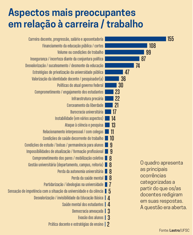 Mas a pesquisa encomendada ao Lastro pela Apufsc mostra que os professores estão, sim, preocupados com o futuro da universidade pública. O questionário indagou aos docentes quais aspectos mais os preocupam em relação à carreira e ao trabalho. Um total de 613 professores da ativa responderam à questão aberta e as expressões mais frequentes que emergiram dessas respostas foram: falta de recursos, futuro da universidade, condições de trabalho, plano de carreira, recursos para pesquisa, falta de perspectiva, reforma da previdência e falta de verbas.