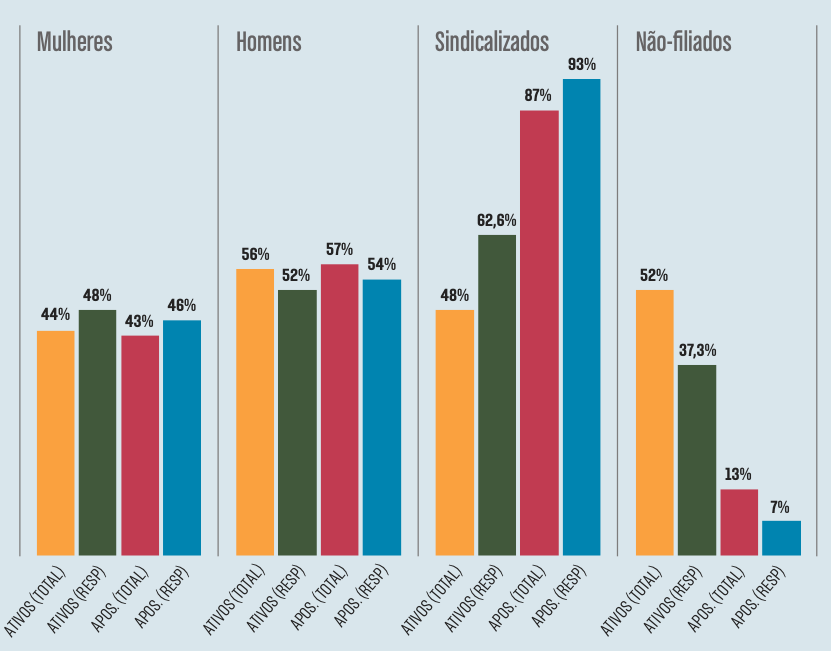 Em 2000, a Apufsc chegou a realizar uma pesquisa que ouviu 333 ativos e aposentados na tentativa de levantar informações que ajudassem a compreender o corpo docente da UFSC. Desta vez, 943 professores e professoras, de um universo de 4,1 mil pessoas, responderam, anonimamente, ao questionário online, entre os dias 16 de agosto e 16 de setembro de 2019. O número superou em 80% a amostra mínima ideal, com a participação de filiados e não filiados. Entre os ativos que responderam ao questionário, quase 40% não têm vínculo com o sindicato.